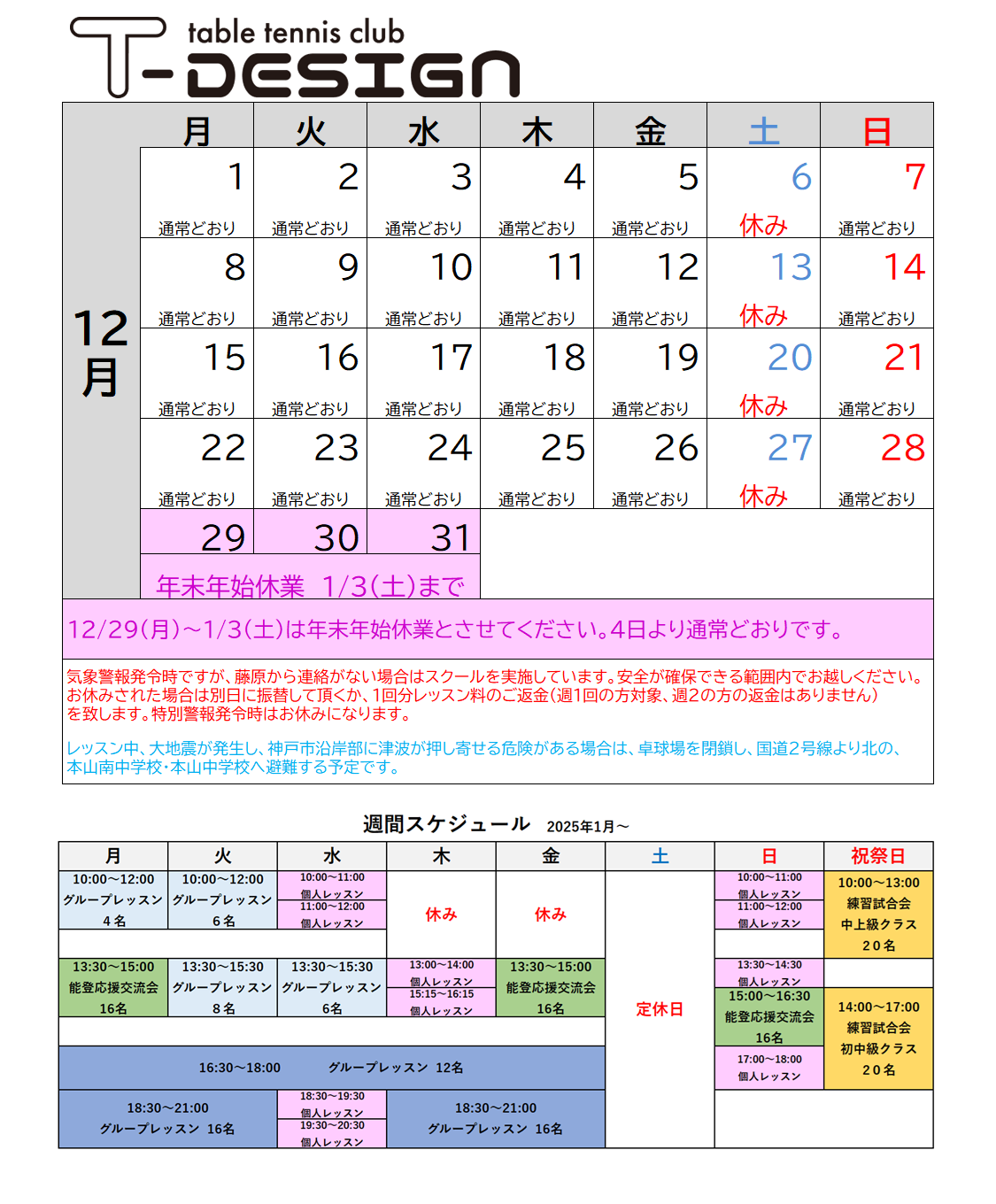 | 15:15〜16:15 個人レッスン | 15:00〜16:30 卓球交流会 16名 | 14:00~17:00 練習試合会 20名 | |||||