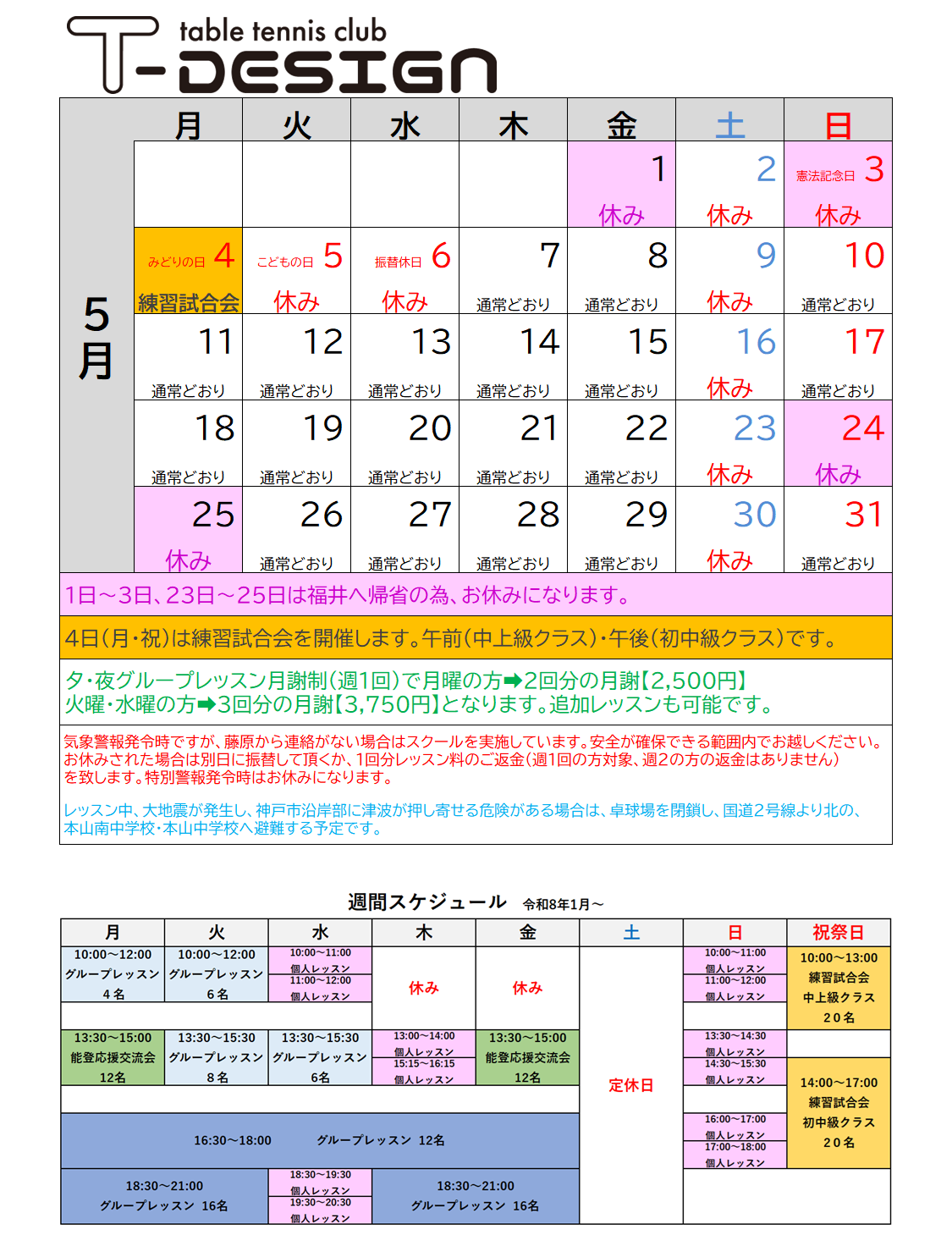 | 18:30〜21:00 グループレッスン16名 | 18:30〜19:30 個人レッスン | 18:30〜21:00 グループレッスン16名 | 令和8年1月より、日曜15:00~16:30の能登応援交流会はなくなり、個人レッスンに変更になっております。 | ||||