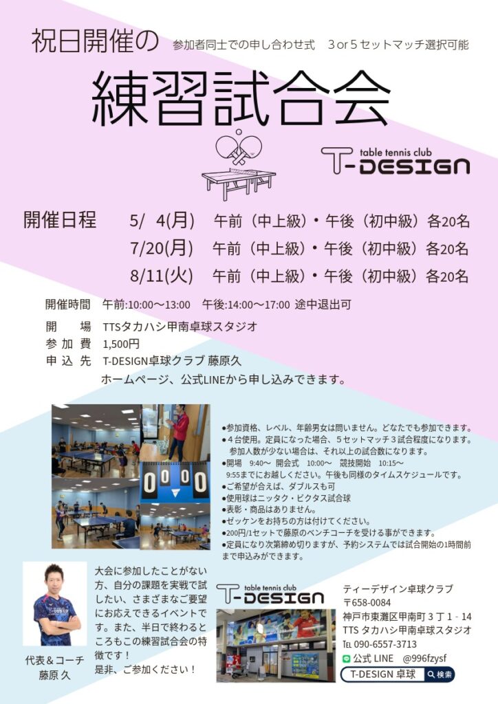 • レベル感ですが、午前は試合に参加されている中上級者中心、午後は試合経験が浅い初中級者中心になっております。年齢、男女区分はありません。