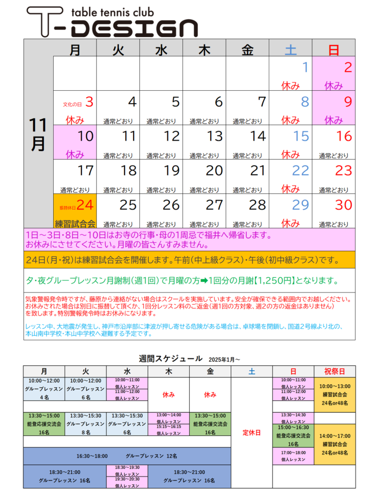 11月・10月の予定表です。 2025年9月30日 最終更新日時 : 2025年9月30日 manager 11/30まで予約システムにてご予約可能です。 10/5(日)・10/31(金)・11/2(日)・11/3(月・祝)・11/9(日)・11/10(月)は、終日お休みです。