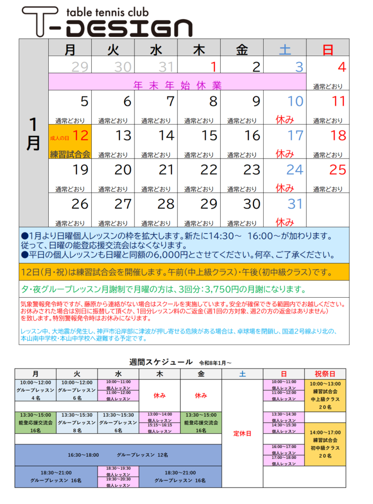 令和8年1月・12月の予定表です。 2025年12月3日 最終更新日時 : 2025年12月3日 manager 1/31まで予約システムにてご予約可能です。 12/29(月)~1/3(土)は、年末年始休業です。年始は1/4(日)から通常通りです。